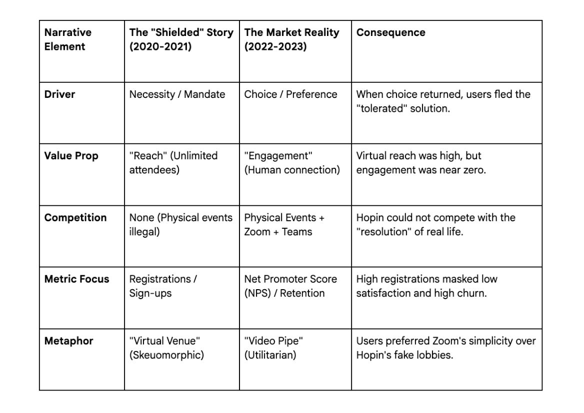 A narrative that relies 100% on a temporary external factor (AI hype cycle, a pandemic) is a shield that will inevitably rust. Hopin failed to use the time and capital provided by the shield to build a product that users loved rather than one they tolerated. They bought growth, but they couldn’t buy retention.