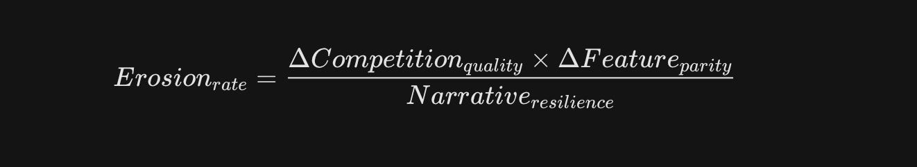 The erosion of a Narrative Shield isn’t random. It can be modeled mathematically as a function of competitive density and narrative differentiation: