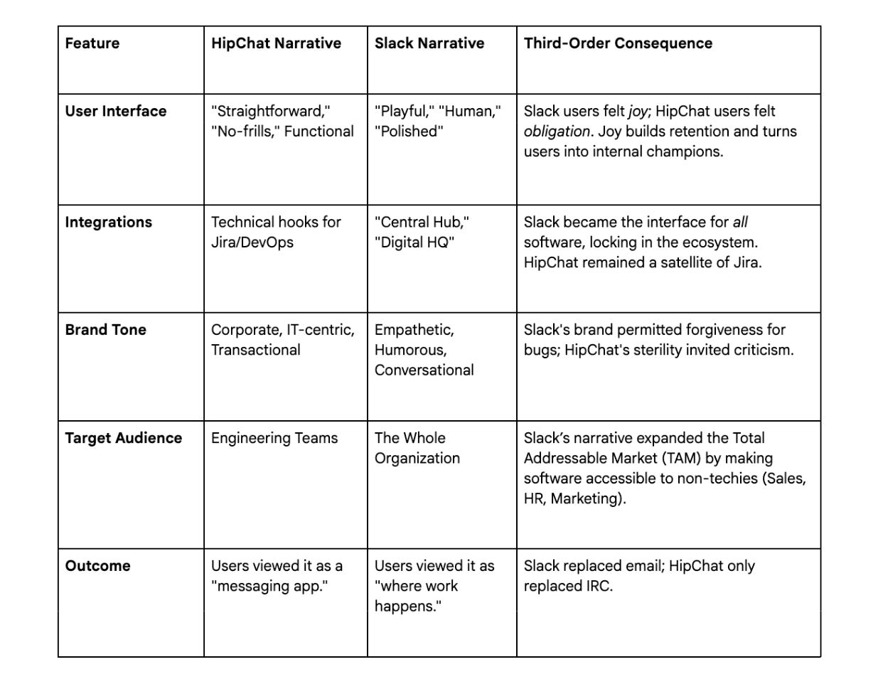 The analysis reveals that while HipChat offered similar features at a better price point, and arguably better project management integrations, it lacked the holistic narrative cohesion.