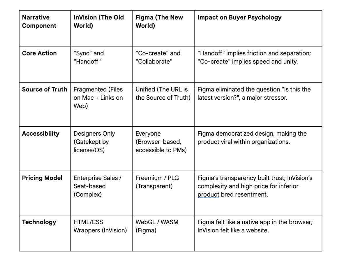 Figma didn’t just build a design tool in the browser; they built a multiplayer game engine for design. Their use of WebGL allowed for real-time collaboration, a technological leap that enabled a new narrative. InVision’s story was about handing off work (Designer → InVision → Developer).